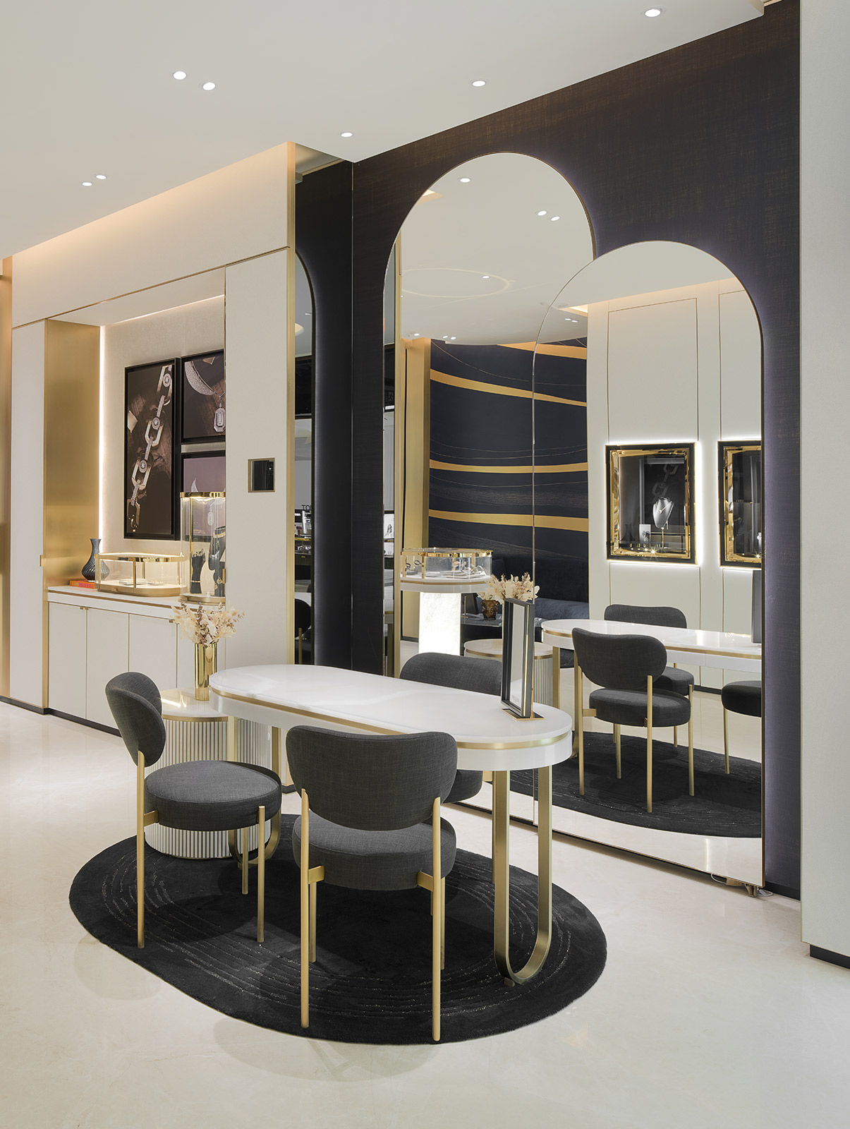 Schwarzer Marmor, Ladentische aus Onyx und prächtige vergoldete Verarbeitungen erschaffen hier eine luxuriöse und moderne Einrichtung. Ein privater VIP-Bereich bietet außerdem einen exklusiven Raum für die Anprobe unserer Haute-Joaillerie-Kreationen.