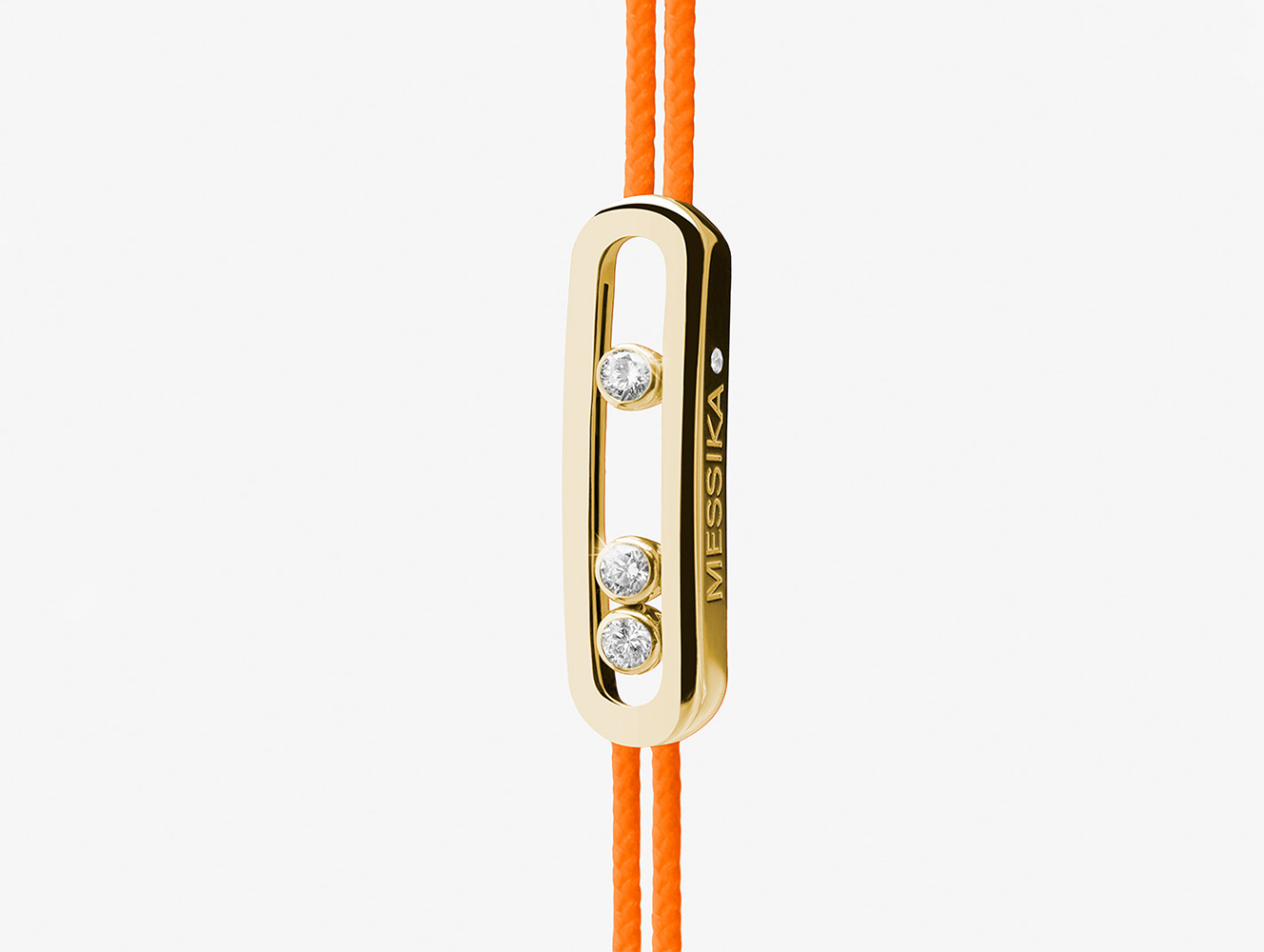 Nuevos colores deslumbrantes para las pulseras de cordón de oro y diamantes Messika CARE(s): rosa, azul, amarillo y naranja. Vista su muñeca con una joya preciosa, elegante y moderna.