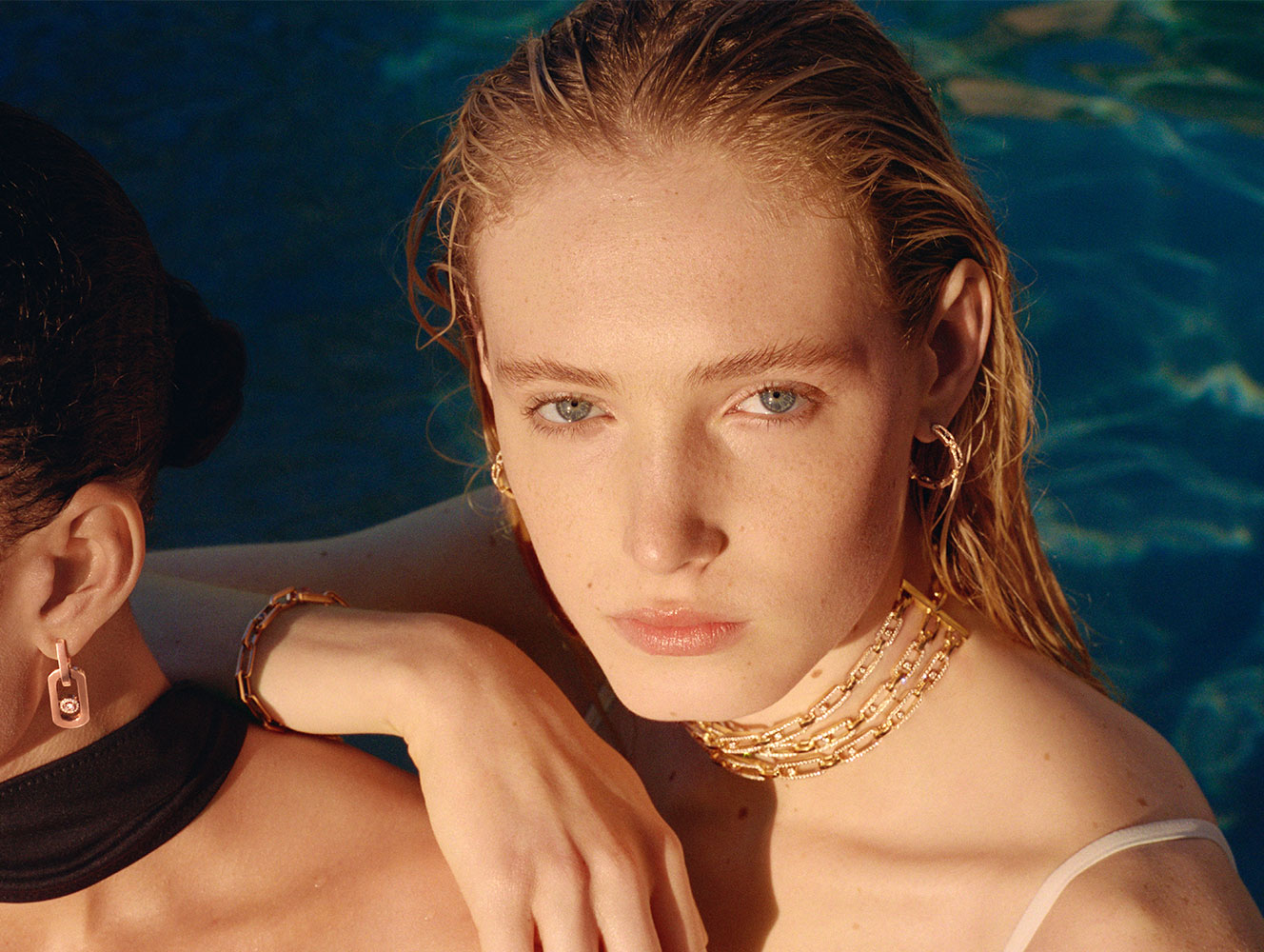Messika da la bienvenida a un verano solar de cine. El oro y los diamantes se funden con la piel bajo una luz cálida, frente al azul infinito.