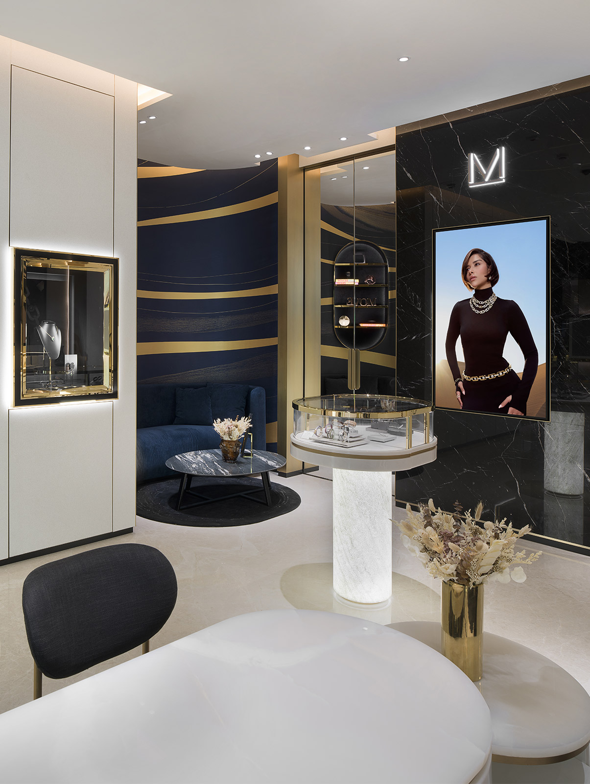 Mármol negro, mostradores en ónice y acabados suntuosos dorados constituyen una decoración lujosa y moderna. Un espacio VIP privado ofrece también un espacio exclusivo para probar nuestras piezas de Alta Joyería.