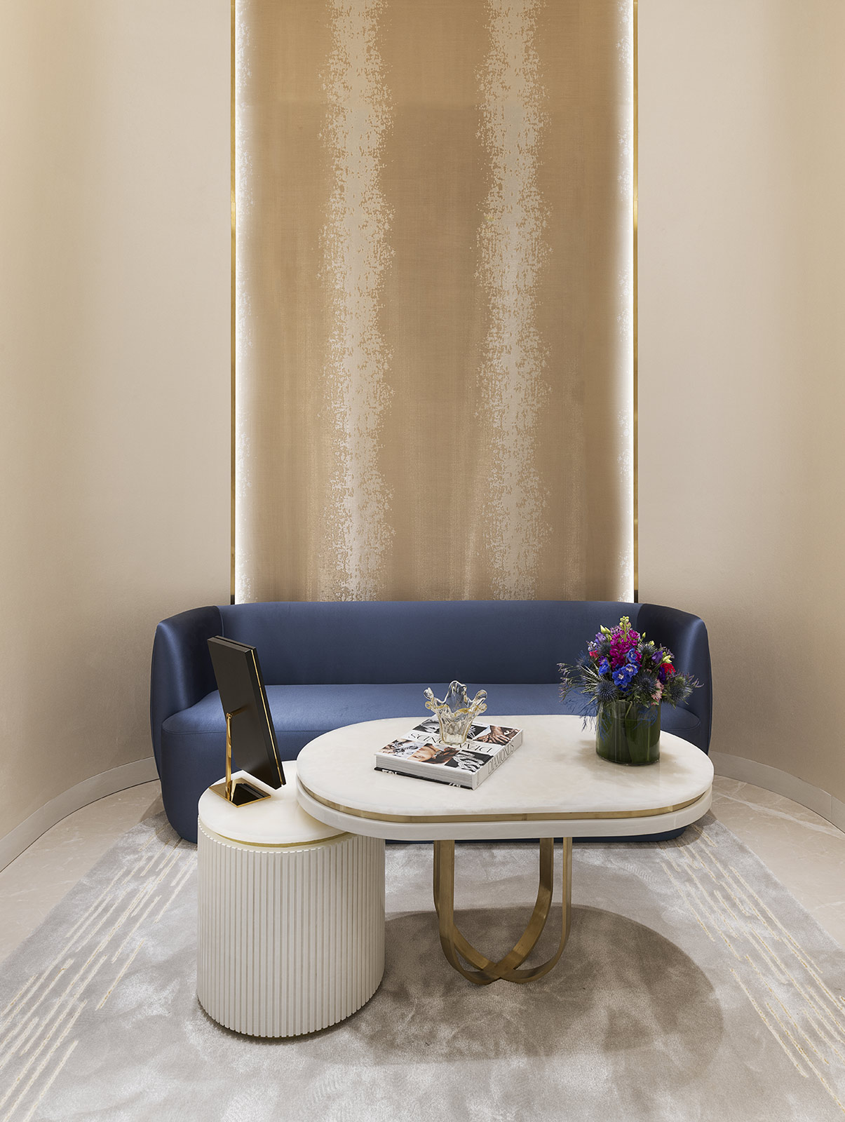 ゴールド使いと洗練されたディテール使いが美しく溶け合い、シックさのなかに華やかさの感じられる格調高いインテリアに仕上がっています。タクタイルなテクスチャード面と、なめらかに研磨された面を巧みにミックスさせることで、あたたかな空気にあふれた現代的な空間が生み出されています。