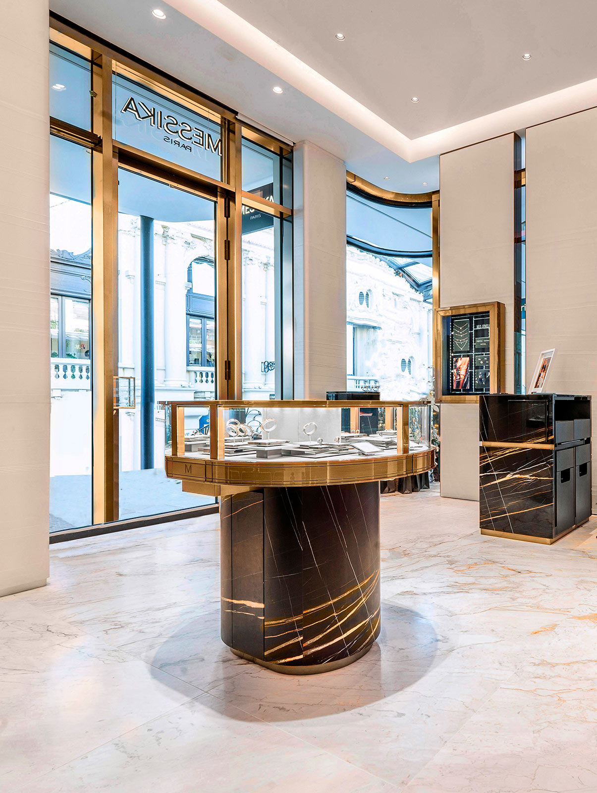 메시카의 정수를 반영한 고급스럽고 현대적인 데코는 화려하게 빛나는 골드, 섬세한 대리석, 화이트 오닉스가 돋보입니다. 은은한 진줏빛이 맴도는 퍼플 컬러의 옴브레 벽지는 아티스트 마틴 버거(Martin Berger)의 아틀리에에서 부티크를 위해 특별히 개발한 독특한 텍스처로 완성되었습니다. 여기에 골드 도금과 투명한 크리스탈 파도로 이루어진 멋진 천장 조명과 메시카 다이아몬드 주얼리의 광채를 반사하는 폭포가 공중에 매달린 디테일이 한층 풍부한 경험을 선사합니다.